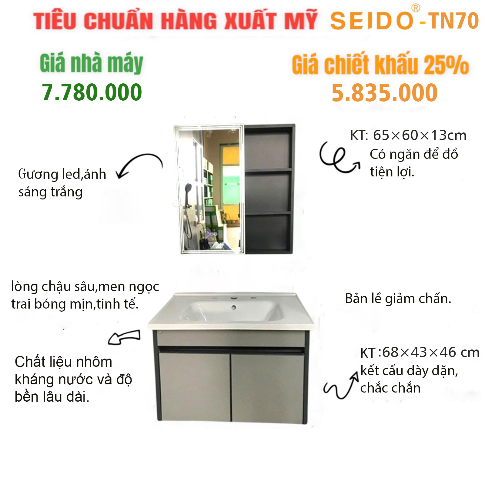 1. Bộ tủ chậu inox TN70 (bảo hành tủ 1 năm,sứ 5 năm,led 1 năm)