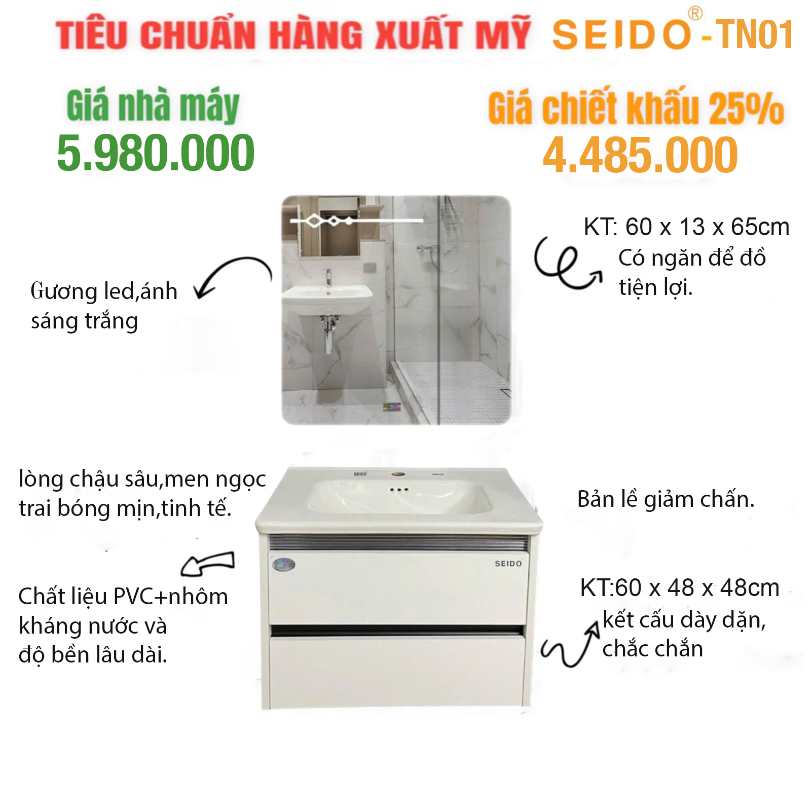 1. Bộ tủ chậu gương TN01 Kích thước: Tủ:60x48x48cm, gương:60x13x65cm